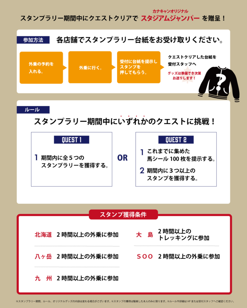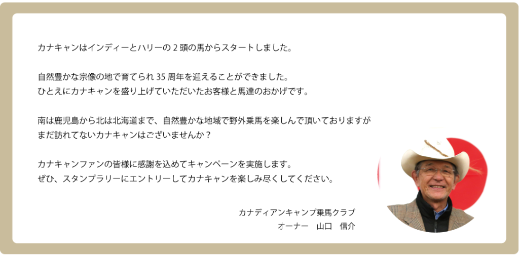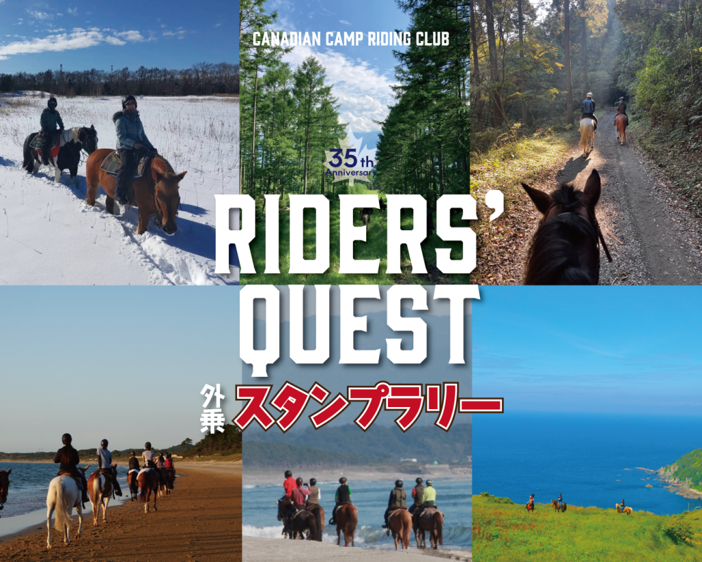 2025.03.23 イベント カナキャン35周年記念 外乗スタンプラリー 2025年、カナディアンキャンプ乗馬クラブは35周年を迎えました。 その記念とこれまでカナキャングループを支えてくださった皆様に感謝の気持ちを込め、 外乗ができる5拠点横断のカナキャンスタンプラリー企画を開催いたします。 浜辺、小川、森林、農道、島、雪、四季折々の自然の恵みを楽しめるカナキャンの外乗。カナキャンを通して、乗馬の面白さ・日本の魅力を再発見してみませんか? スタンプラリー期間 2025年4月1日(火)~2026年9月30日(水) 注意事項 ※クエストを達成したら、受付へスタンプラリー台紙をご提示ください。※スタンプの獲得は、基本2時間以上の外乗が条件です。(天候やこちらの予約状況より、やむを得ない場合はこれに限りません。)※馬シール100枚はスタンプ3つ以上と合わせて受付スタッフへ提示ください。シールをもらっていない、失くした場合は無効です。※スタンプの押印は、騎乗した本人のみに限ります。※スタンプラリーの台紙をなくした場合は無効となります。 スタンプ設置店舗 カナディアンキャンプ北海道 「乗馬クラブリーフ」 新千歳空港からは車で約20分。北海道の大地が織りなす豊かな自然と、鮮明な季節の移り変わりの中で、ゆっくり乗馬を楽しんでみませんか? 詳しく見る カナディアンキャンプ乗馬クラブ八ヶ岳 馬の町小淵沢で豊かな森を楽しみながら外乗。移り行く四季を体いっぱいに感じてください。馬上から眺める富士山や八ヶ岳連峰は圧巻です。 詳しく見る カナディアンキャンプ乗馬クラブ 九州 延々と続くの玄界灘の海岸線に、山や農道、季節ごとに色着く花々。お好みに合わせてコースをアレンジいたします。 詳しく見る カナディアンキャンプ大島牧場 福岡最大の島で馬とめぐる世界遺産の旅。大島ならではのアップダウンのあるトレッキングコースで、息を吞むような絶景をご堪能あれ。 詳しく見る カナディアンキャンプ乗馬クラブ SOO 広大な自然が広がる鹿児島で太平洋を望む海岸、連綿と続く松原、瑞々しい森林を楽しめる外乗ツアーがおすすめ。 詳しく見る お問合せ カナディアンキャンプ乗馬クラブ 九州0940-62-1912ccr@canacan.jpカナキャン九州 公式LINE https://lin.ee/anaIsIm 【大島牧場×Bravo!コラボ】割引券配布中! 前の記事 大島牧場ふるさと寄付の成果報告 次の記事
