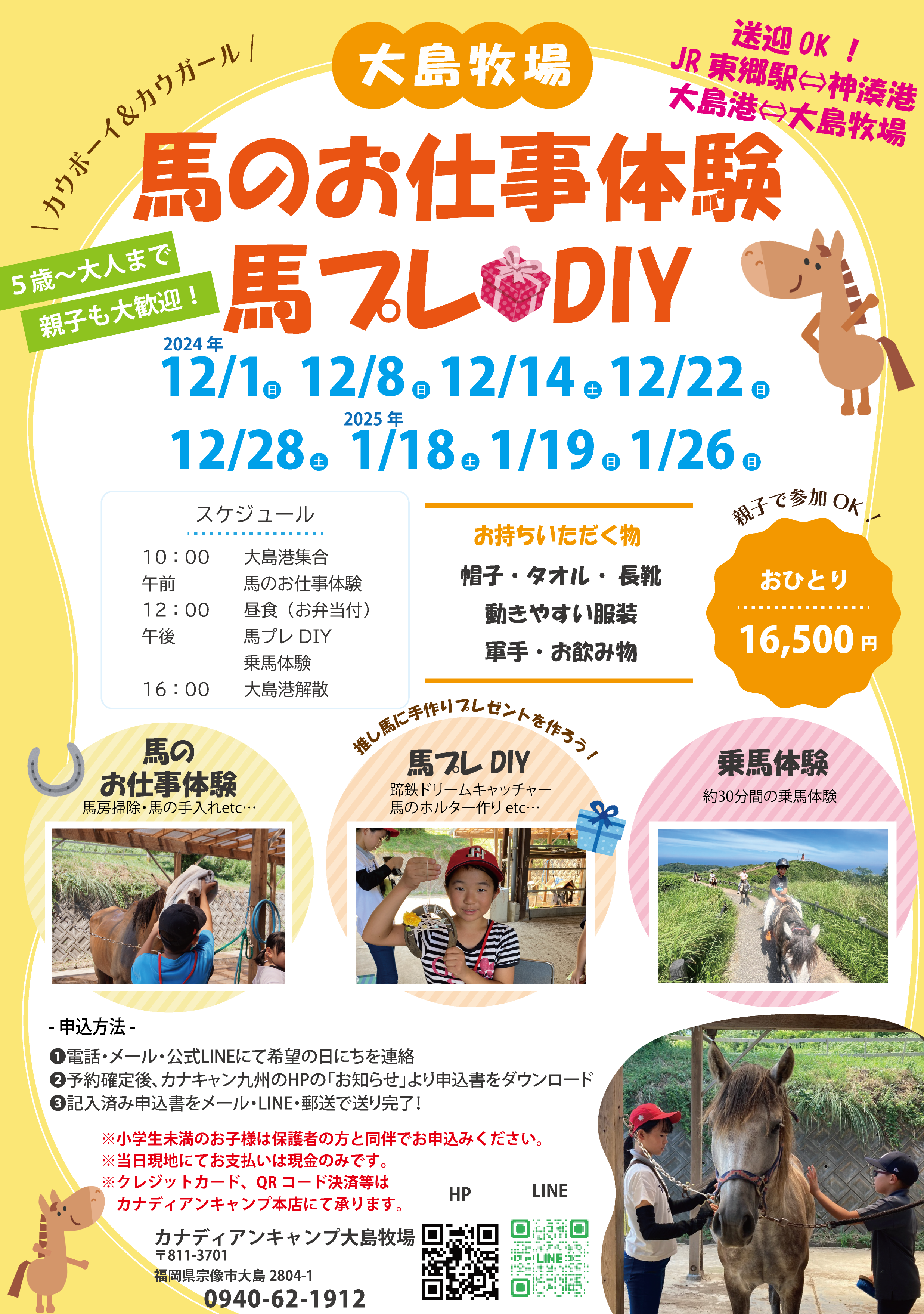 【スケジュール】 10:00 大島港集合 午前 馬のお仕事体験 12:00 昼食(お弁当付き) 午後 馬プレDIY 乗馬体験 16:00 大島港解散
