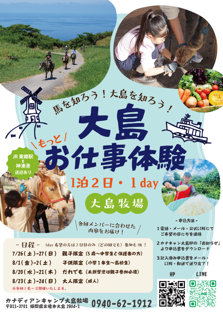 2025.05.31 イベント 馬を知ろう!大島を知ろう!「大島もっとお仕事体験」 馬を知ろう!大島を知ろう!「大島もっとお仕事体験」の開催が決定しました!大島牧場のお仕事や、島と大島牧場の関わりを楽しく体験しながら学びます。馬のことはもちろん大島のことをもっと好きになる1泊2日です。各回メンバーに合わせた内容でお送りします。宿泊が難しい方は2日目のみの1day参加もOKです。(対象年齢以外のお日にちでも)5歳~大人まで楽しめる内容ですので、ファミリーでもご参加いただけます。 一緒に楽しい夏の思い出を作りましょう! ※対象年齢:5歳以上です。未就学児は保護者同伴でお申込みください。※宿泊施設にはタオル、アメニティがございません。ご持参くださいませ。 【ご予約方法】①カナキャン九州公式LINE・お電話・メールにてご希望のお日にちを連絡②申込書をダウンロード 申込書ダウンロードする▼③必要事項をご記入の上、公式LINE/メール郵送/Fax/メール等で送信 公式LINE : https://lin.ee/anaIsImTEL : 0940-62-1912(カナキャン九州)Email : oshima@canacan.jp 【キャンセル規定】前日キャンセル:料金の50%当日キャンセル:料金の100% 八ヶ岳・神戸レッスン時間・料金改定のお知らせ 前の記事 お父さんと馬に乗ろう。父の日キャンペーン 次の記事