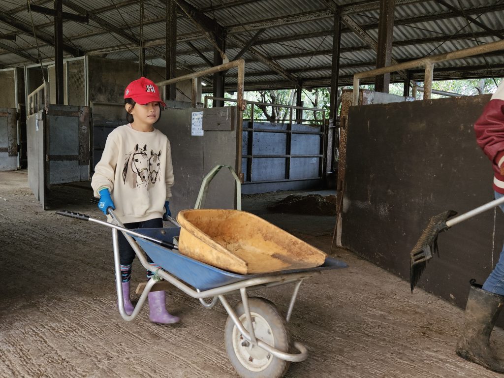 お馬さんのお部屋の掃除や牧場のお仕事をまるっと体験!乗馬だけでなく、馬たちともっと触れ合える、もっと知れる1日です。
