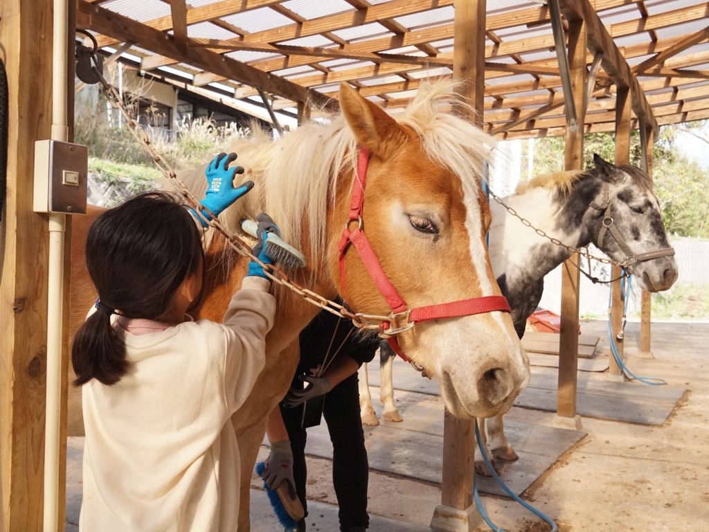 馬に触ってみたり、ブラッシングやエサやり体験、馬と一緒に写真を撮った、。馬には乗らずに、大島牧場の優しい馬たちとふれあってみよう!大人の馬だけではなく、大島牧場ならではの仔馬たちともふれあえます。